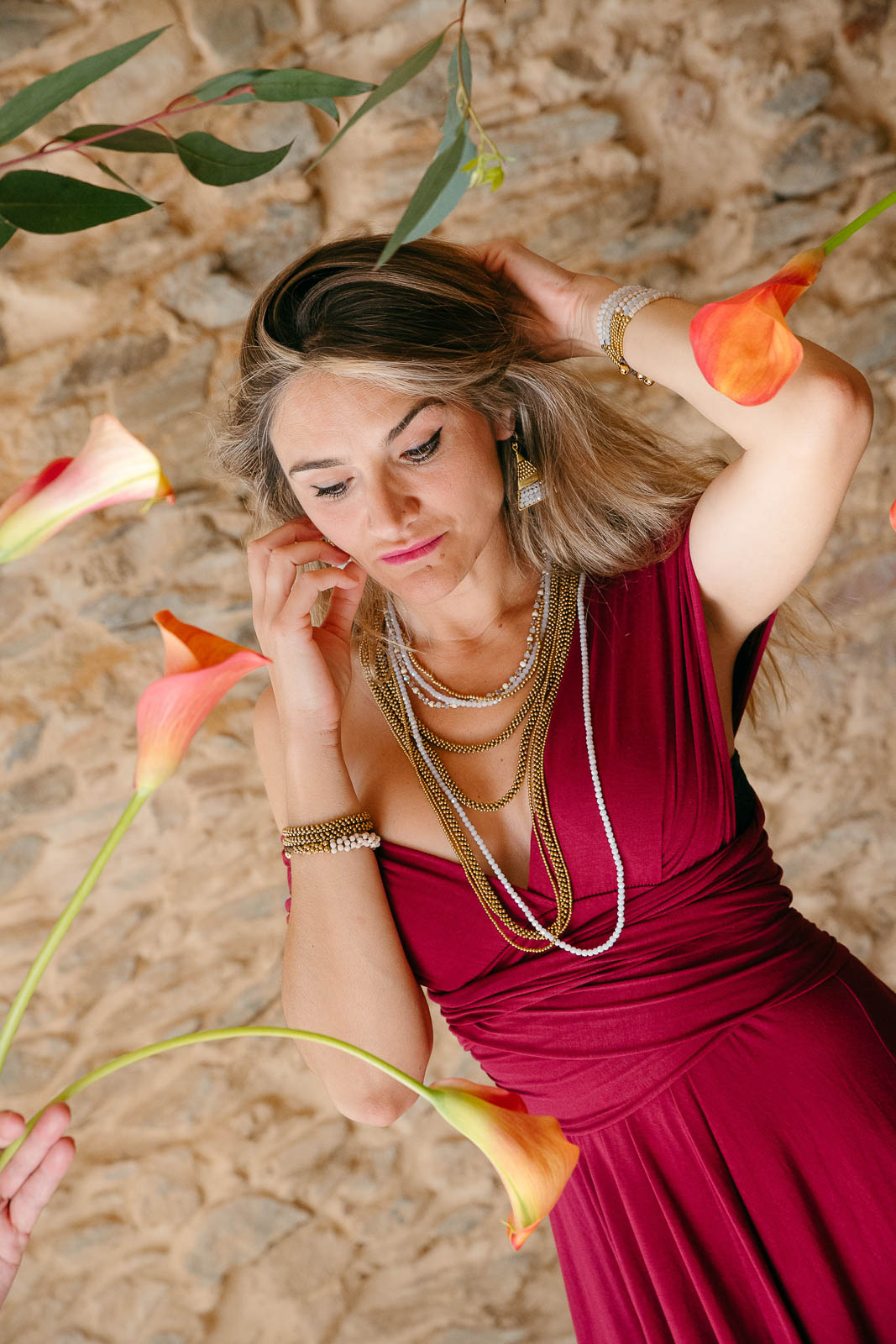 Su diseño permite llevarlo solo o combinado con collares más cortos. En las imágenes la modelo aparece junto a varias capas y colores de la misma colección; esos modelos están actualmente agotados. Al tratarse de piezas artesanales, volverán a estar disponibles más adelante, pero por ahora el único disponible es el collar Lagoa largo.