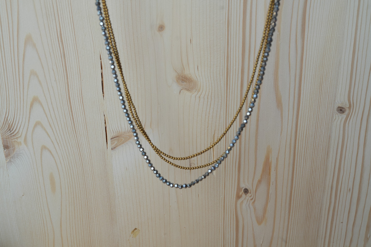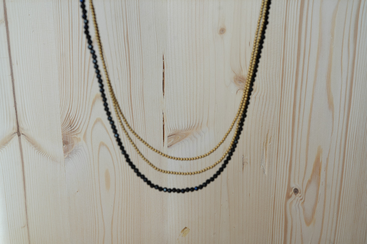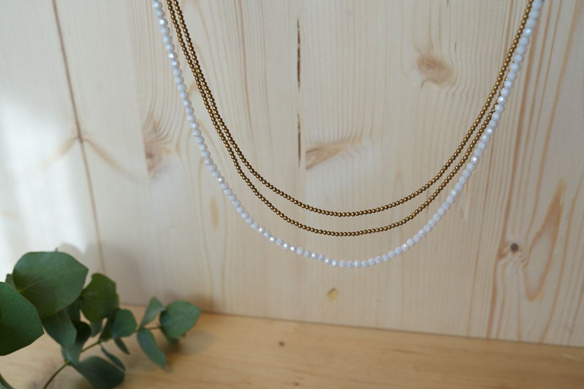 Lagoa 82 cm es el collar más largo de la serie. Está elaborado a mano con hilo encerado resistente, cuentas metálicas de latón y cristal facetado — según el color elegido, blanco, gris, negro — para conseguir un acabado uniforme y duradero.