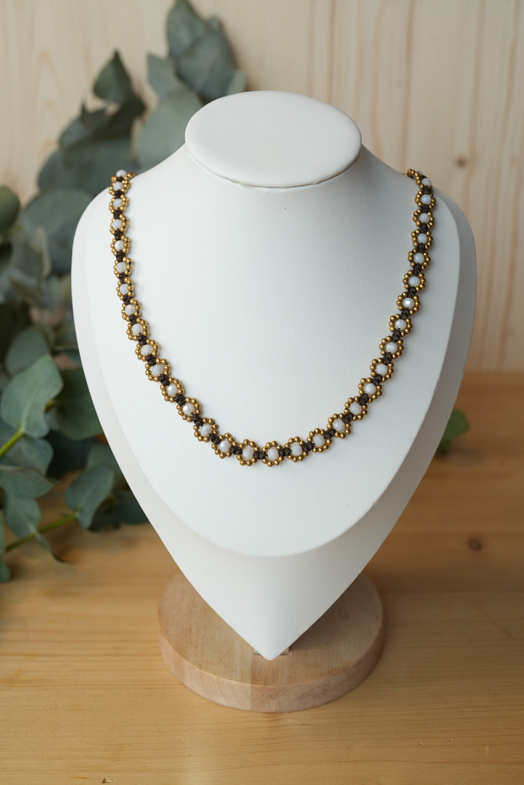 Necochea blanco es una pieza hecha a mano con cuentas facetadas en tono nácar y detalles de latón que estructuran el diseño con un acabado floreado.