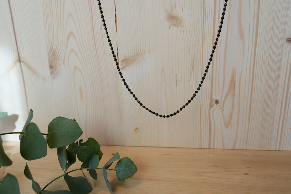 Una línea oscura como tinta y un destello dorado que la abraza: Odeceixe juega con el contraste y lo convierte en un gesto de estilo. Este diseño largo, tejido a mano con hilo encerado, combina cristales negros y piezas de latón dorado que aportan profundidad, brillo y una elegancia discreta que se revela con la luz.