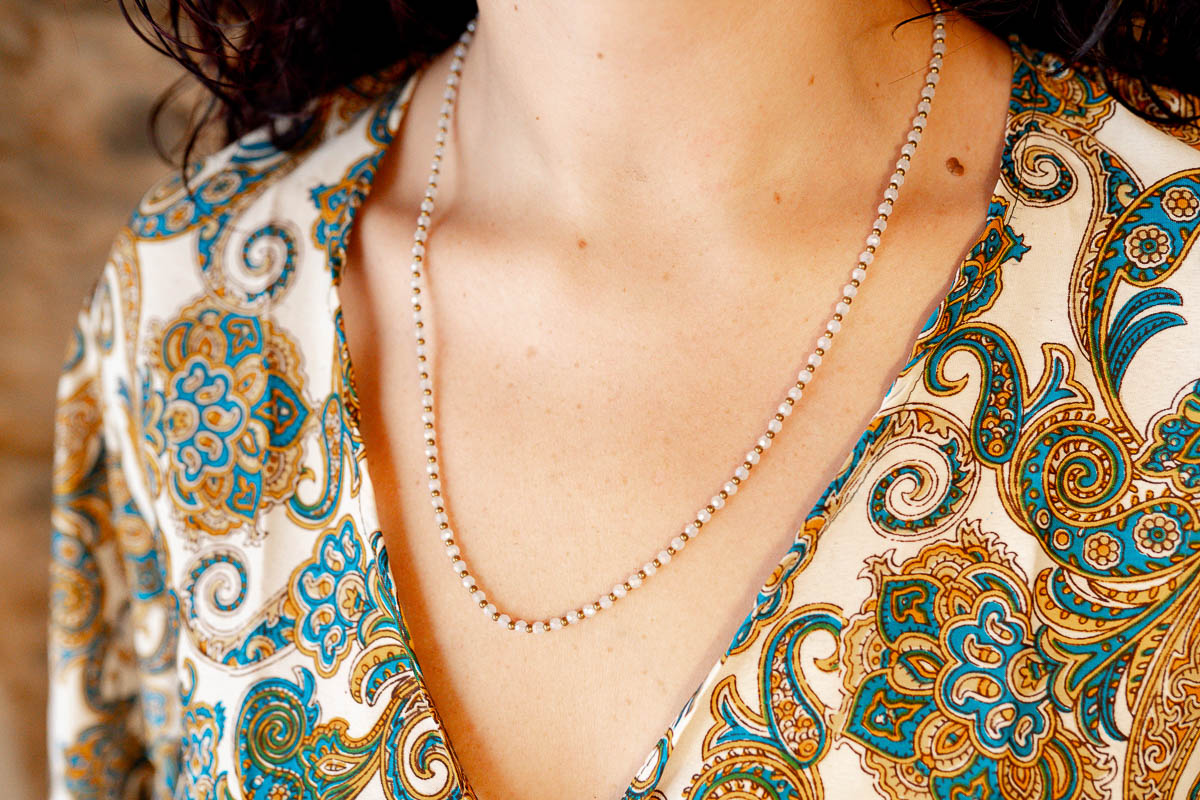 Hay joyas que iluminan sin necesidad de imponerse. Odeceixe pertenece a esa categoría: una línea fina de blancos suaves y destellos dorados que se desliza sobre el escote con naturalidad absoluta. La combinación de cristales blancos y piezas de latón crea un ritmo delicado.