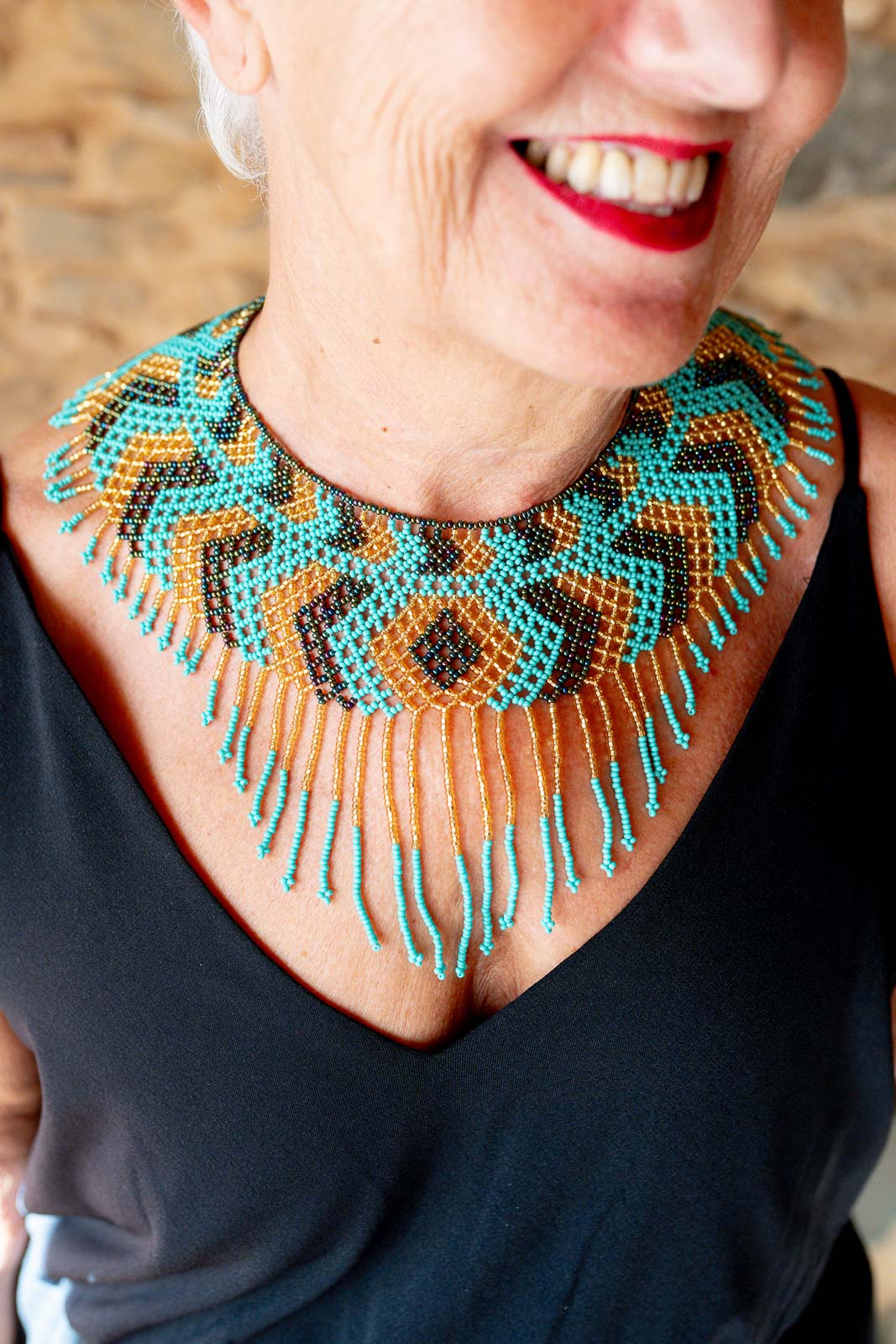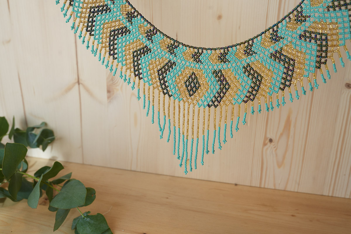 Destaca por la combinación de turquesa, dorado y cuentas multicolor, trabajadas a mano en un tejido geométrico de gran precisión. Los flecos largos añaden movimiento y permiten que la pieza se adapte bien al contorno del cuello sin perder forma.