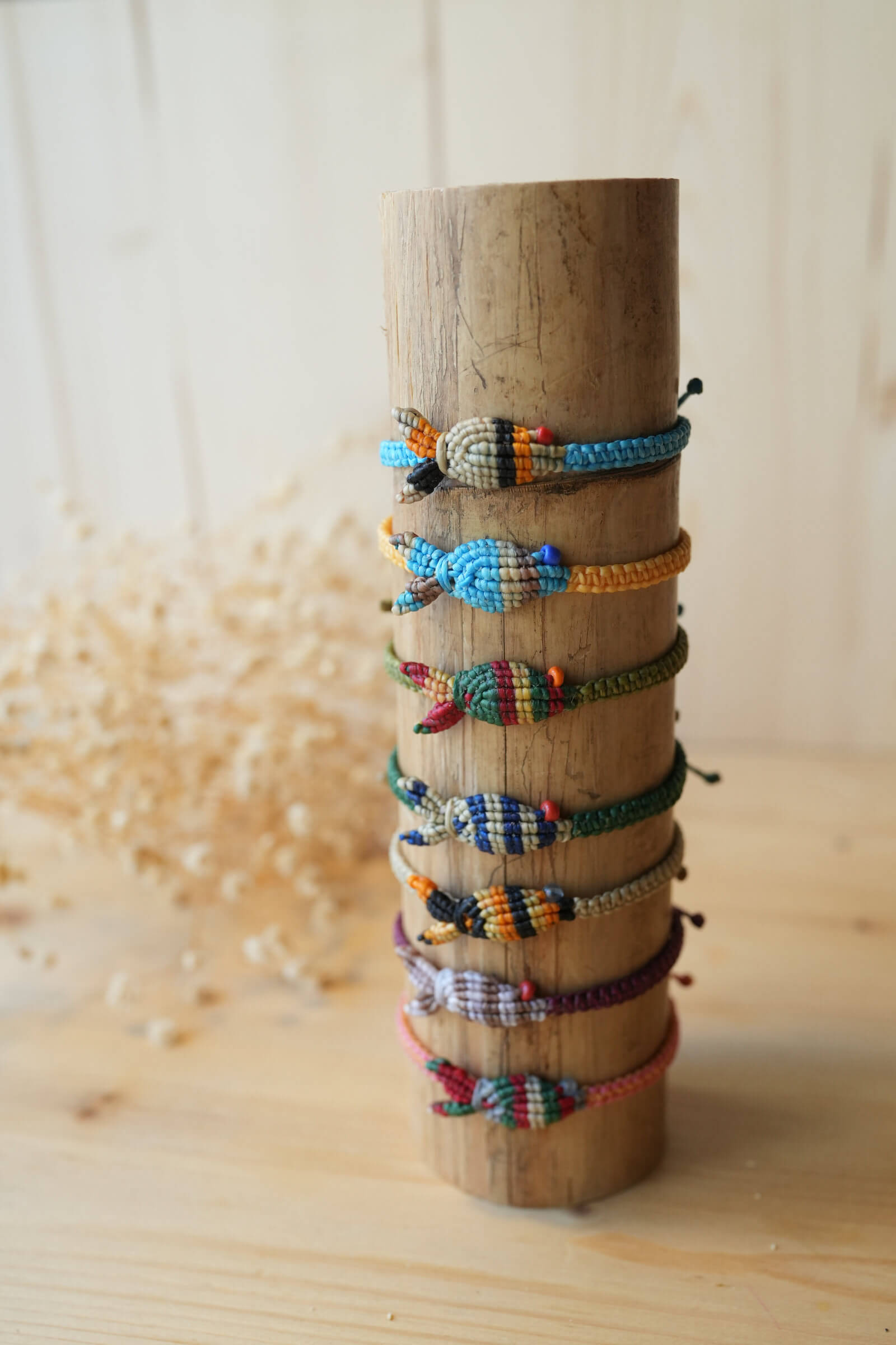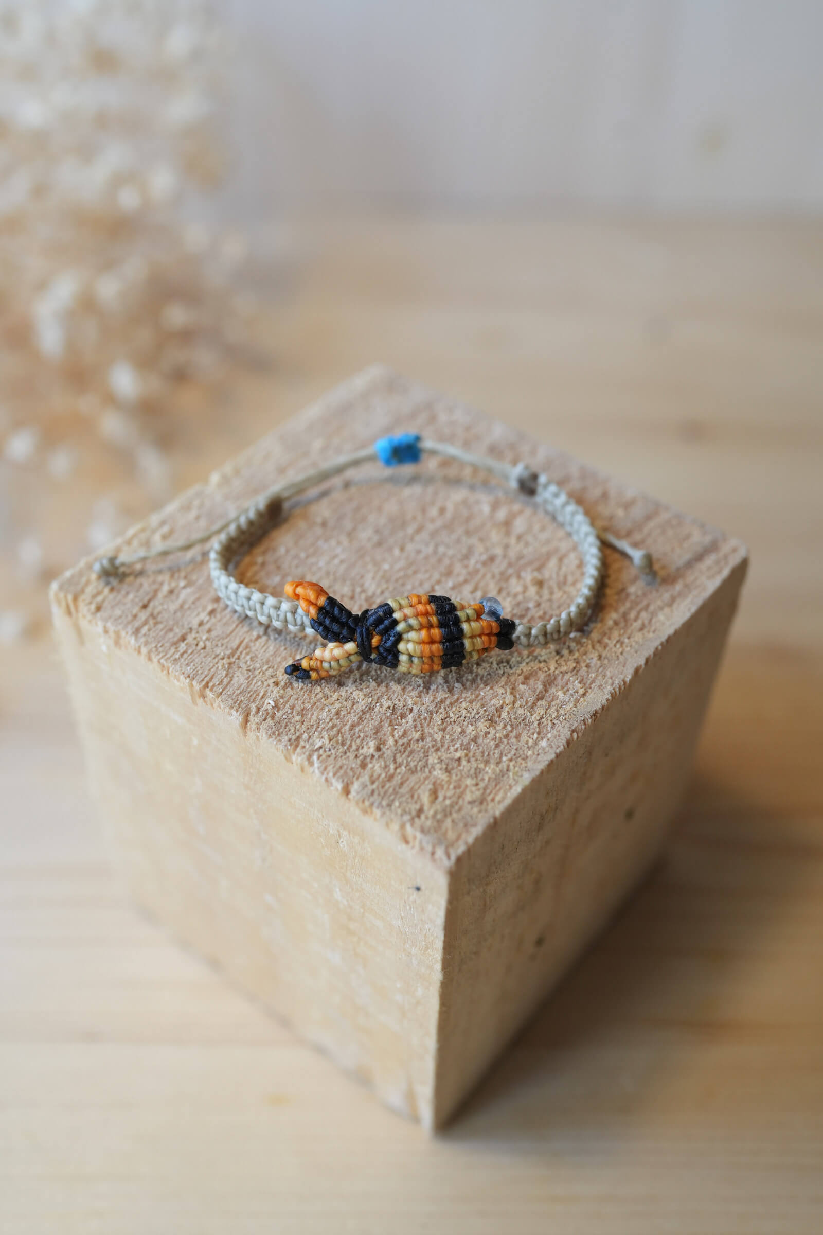 Pulsera artesanal tejida en macramé, con una figura central en forma de pez realizada en tonos mostaza, naranja, beige, negro y un pequeño detalle en el ojo azul. La base del cordón es de color beige claro, creando un diseño equilibrado y fácil de combinar.
