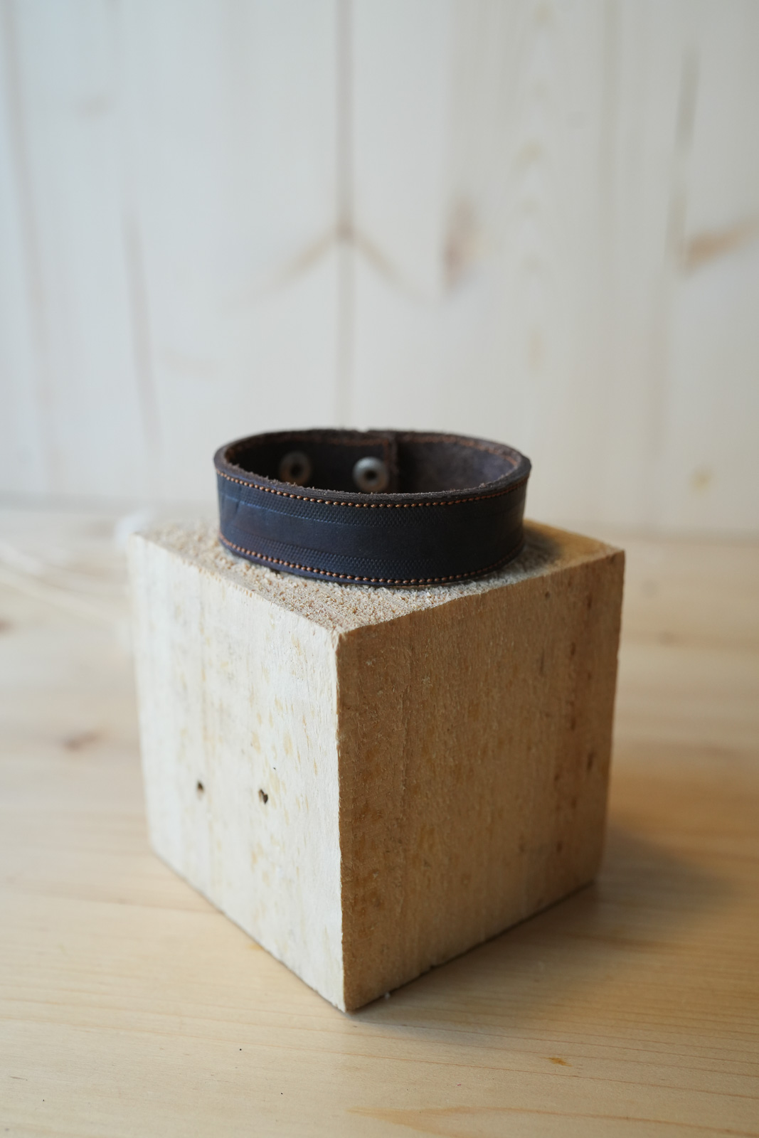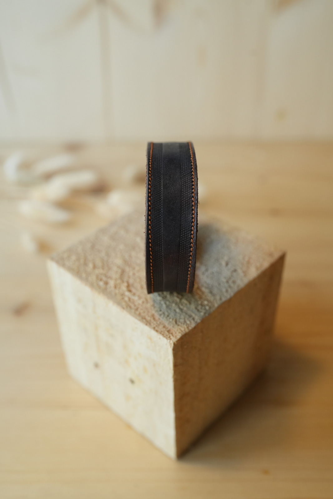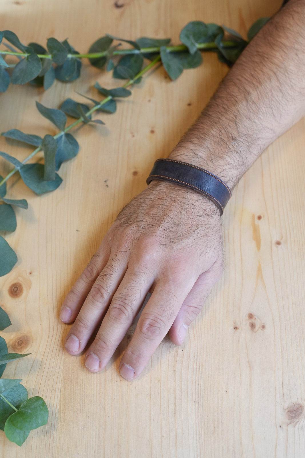 Pulsera artesanal de cuero plano, trabajada con un borde de hilo que recorre toda la pieza como un pequeño sendero de puntadas, discreto.