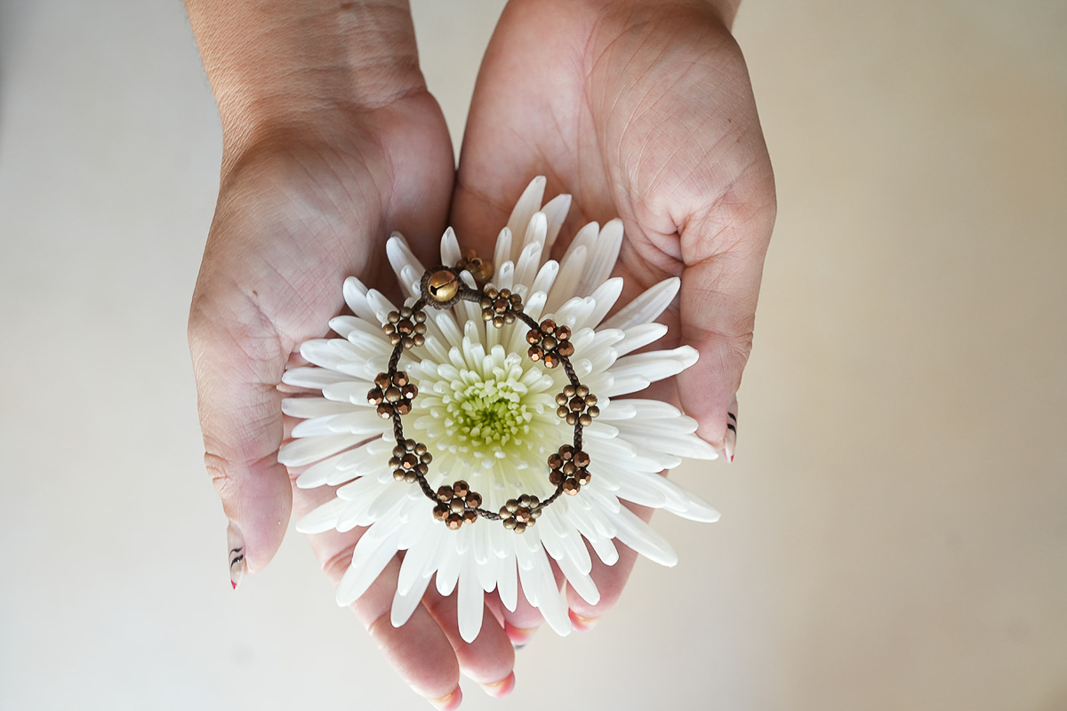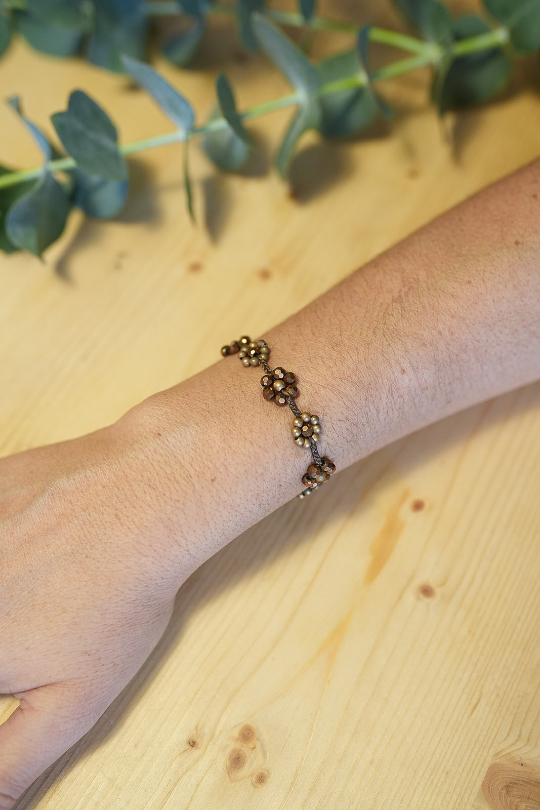 Esta versión combina pequeñas flores trenzadas con cuentas de acabado metalizado en tonos tierra, creando ese brillo sutil que solo se revela cuando la luz toca el movimiento.