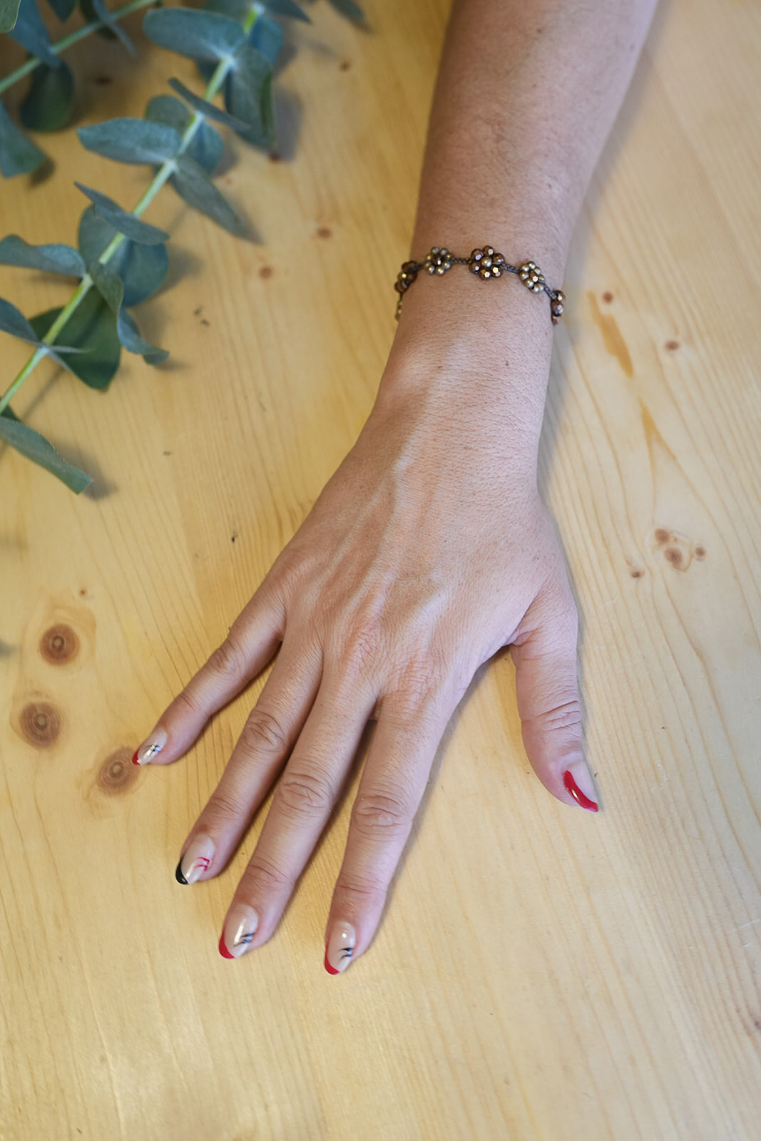 Cada flor está entrelazada una a una sobre hilo encerado resistente, dando forma a una pieza ligera, flexible y pensada para acompañarte cada día sin perder su delicadeza.
