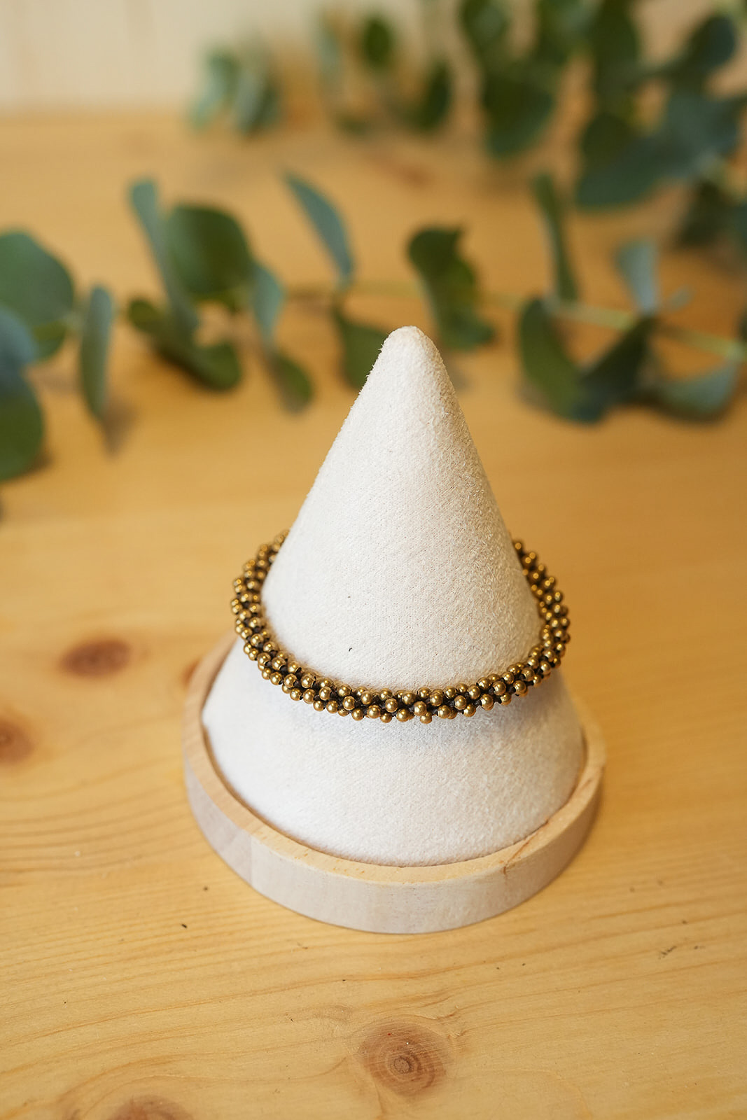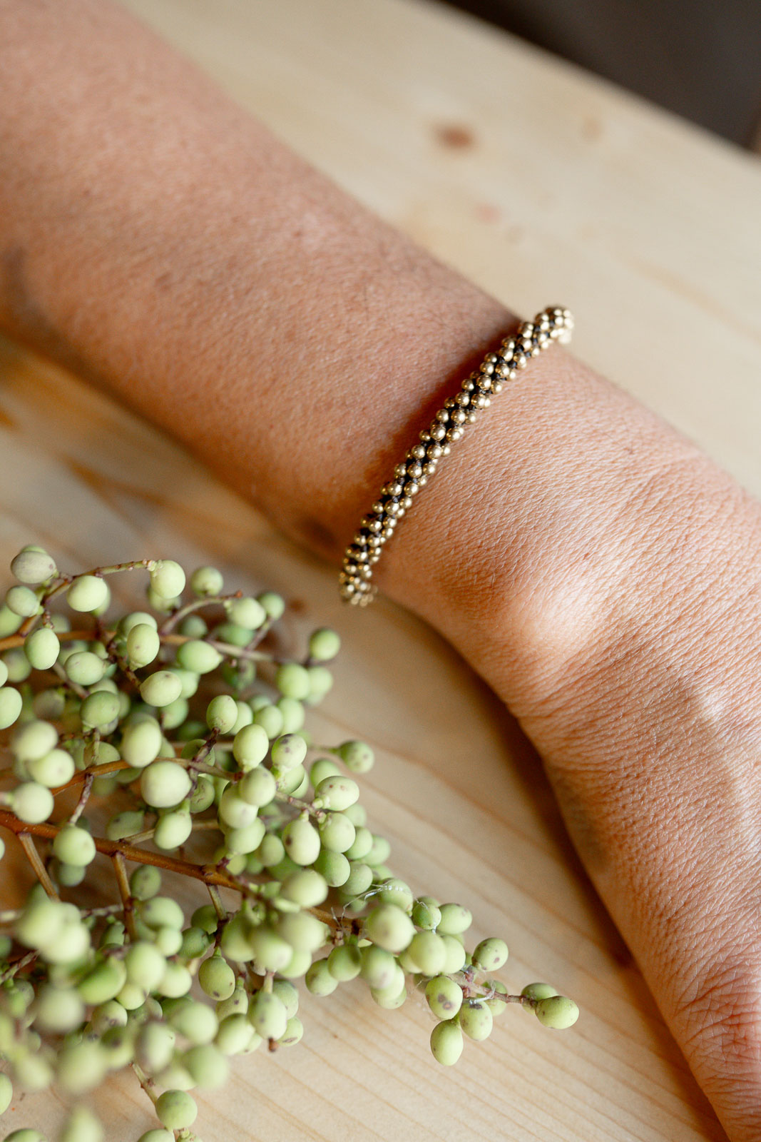 • Pulsera tejida a mano con cuentas doradas.