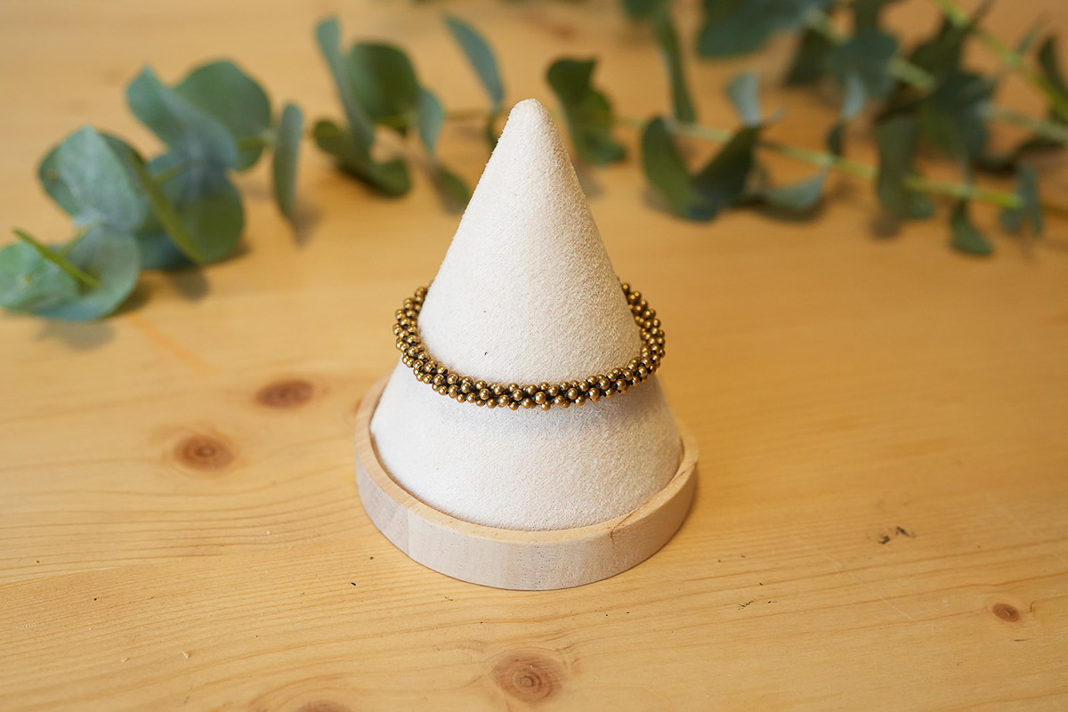 Su diseño tubular de cuentas de latón tejidas a mano crea un brillo sutil que se adapta con naturalidad a cualquier estilo.
