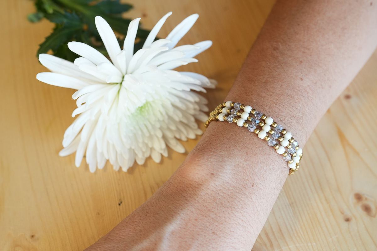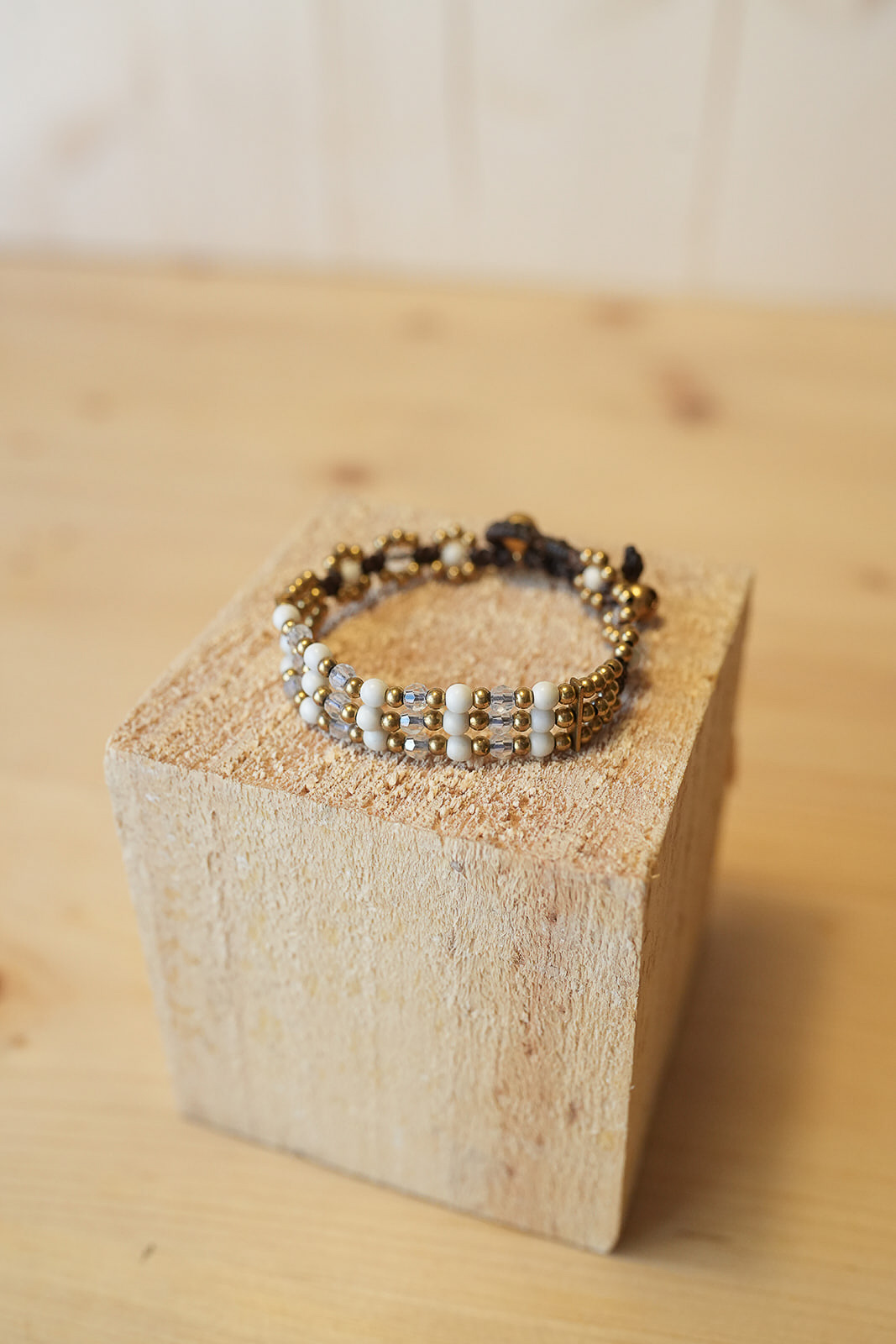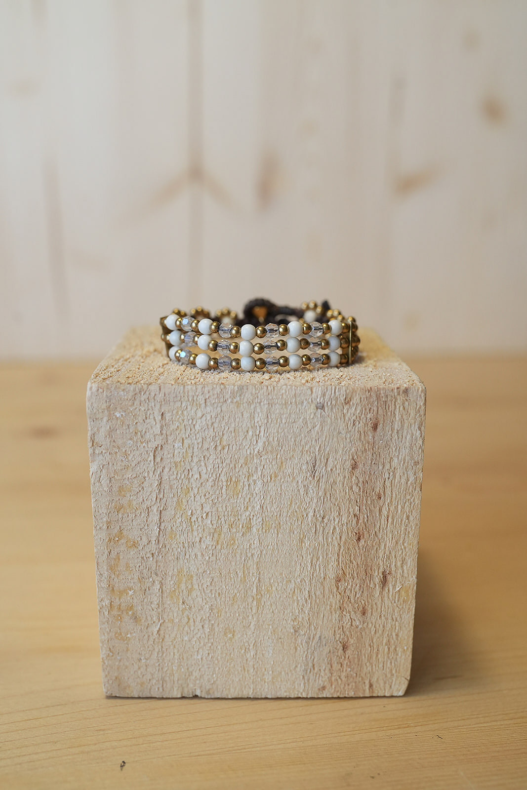 Un equilibrio perfecto entre luz y textura. Kalasin combina tres líneas de cuentas blancas y transparentes con acentos de latón pulido que aportan un brillo sutil y muy favorecedor.