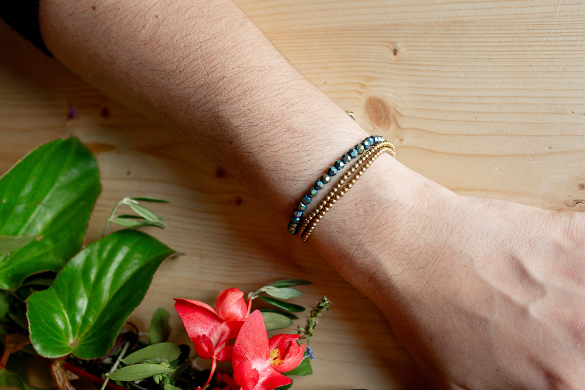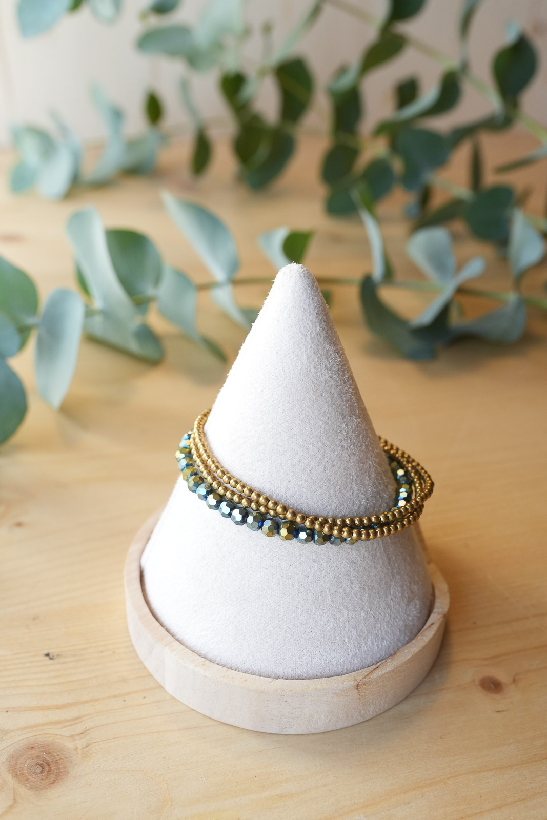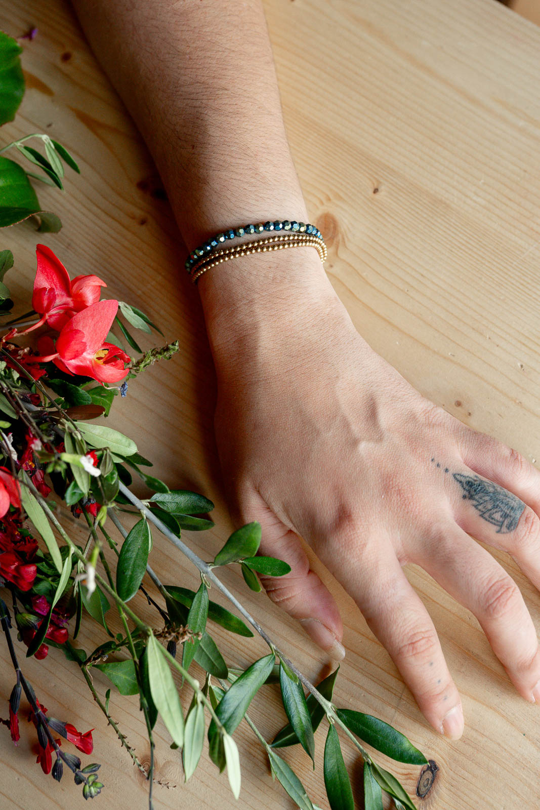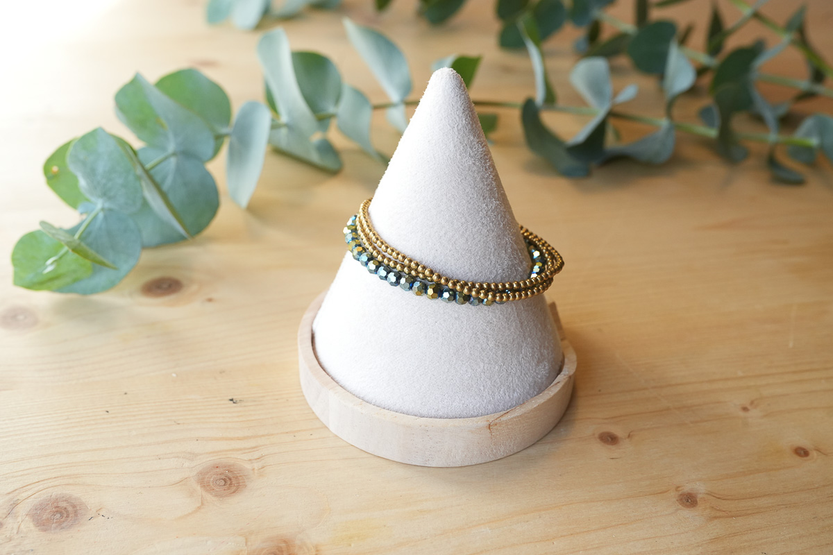 Una trenza de luz gris azulado / verde que serpentea alrededor de la muñeca con una hebra de cristales facetados y dos líneas doradas que aportan el toque cálido.