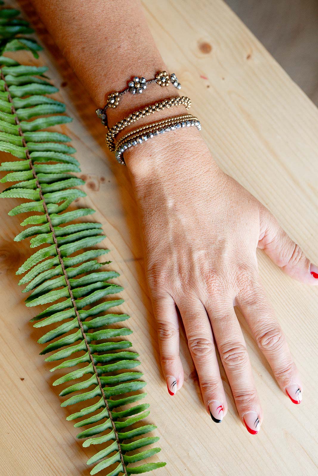 Hay piezas que no necesitan anunciarse la pulsera Lagoa es una de ellas. Una trenza de luz gris que serpentea alrededor de la muñeca con una hebra de cristales facetados y dos líneas doradas que aportan el toque cálido.