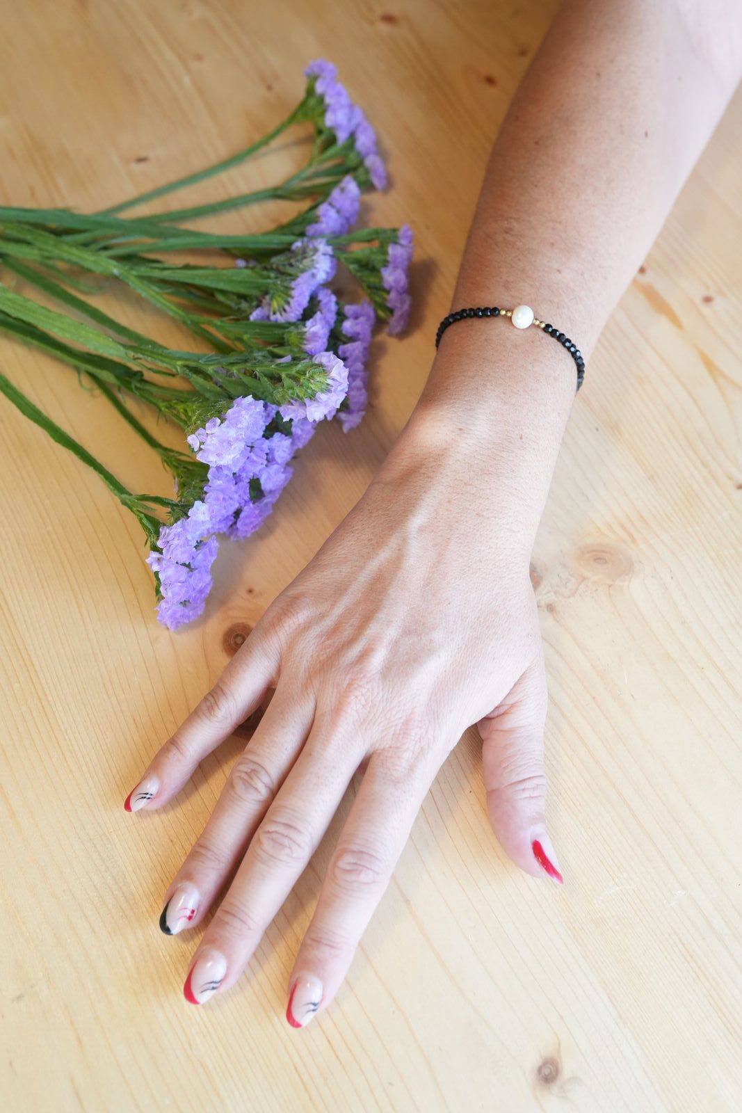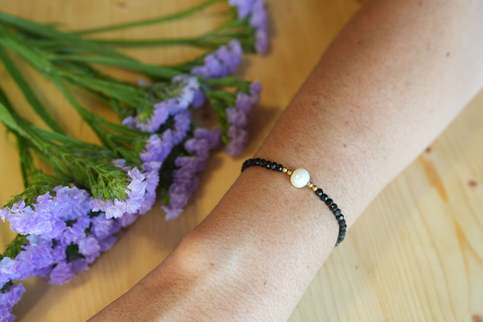 Muse es una pulsera pensada para quienes buscan un diseño sencillo, ligero y con un toque de contraste. Está formada por cuentas negras facetadas y una perla natural