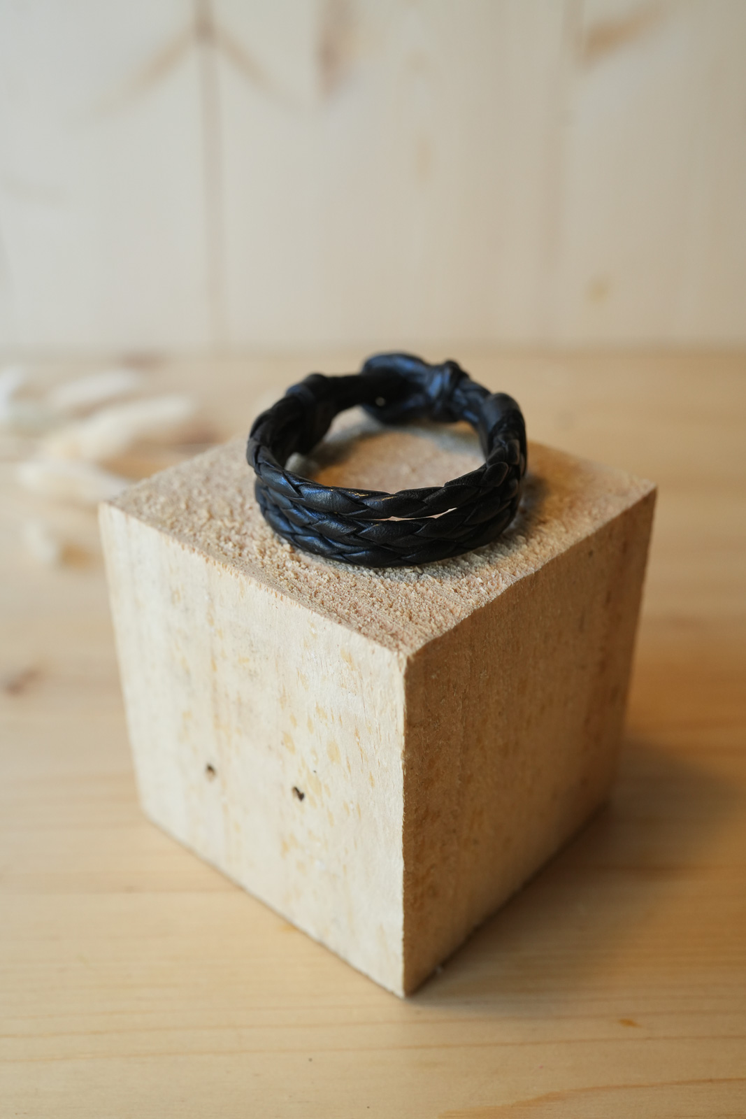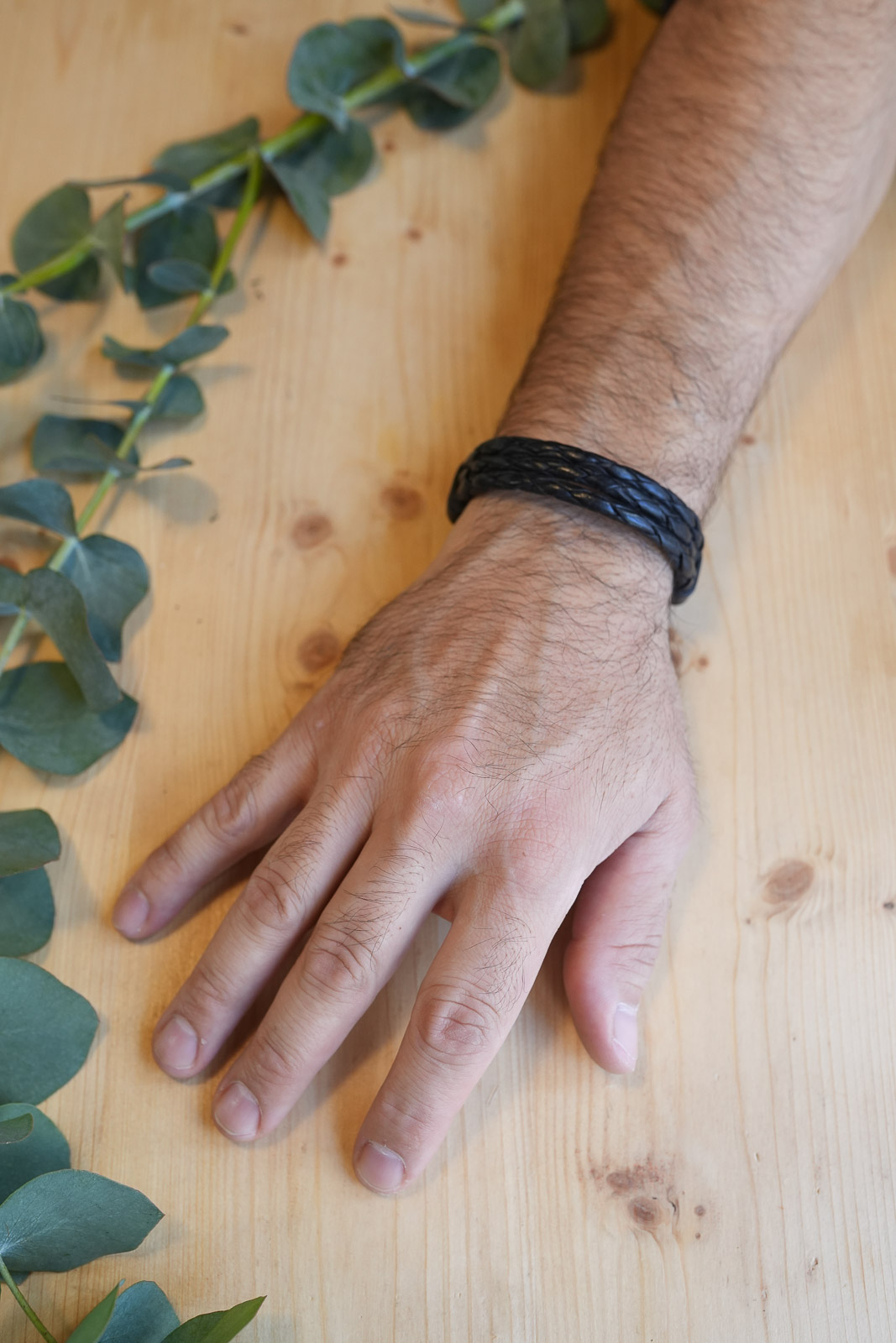 Esta pulsera está hecha utilizando un trenzado ancho que aporta estructura y un acabado limpio. El cierre de ojal y botón, elaborado con el mismo cuero, asegura resistencia y coherencia en toda la pieza.